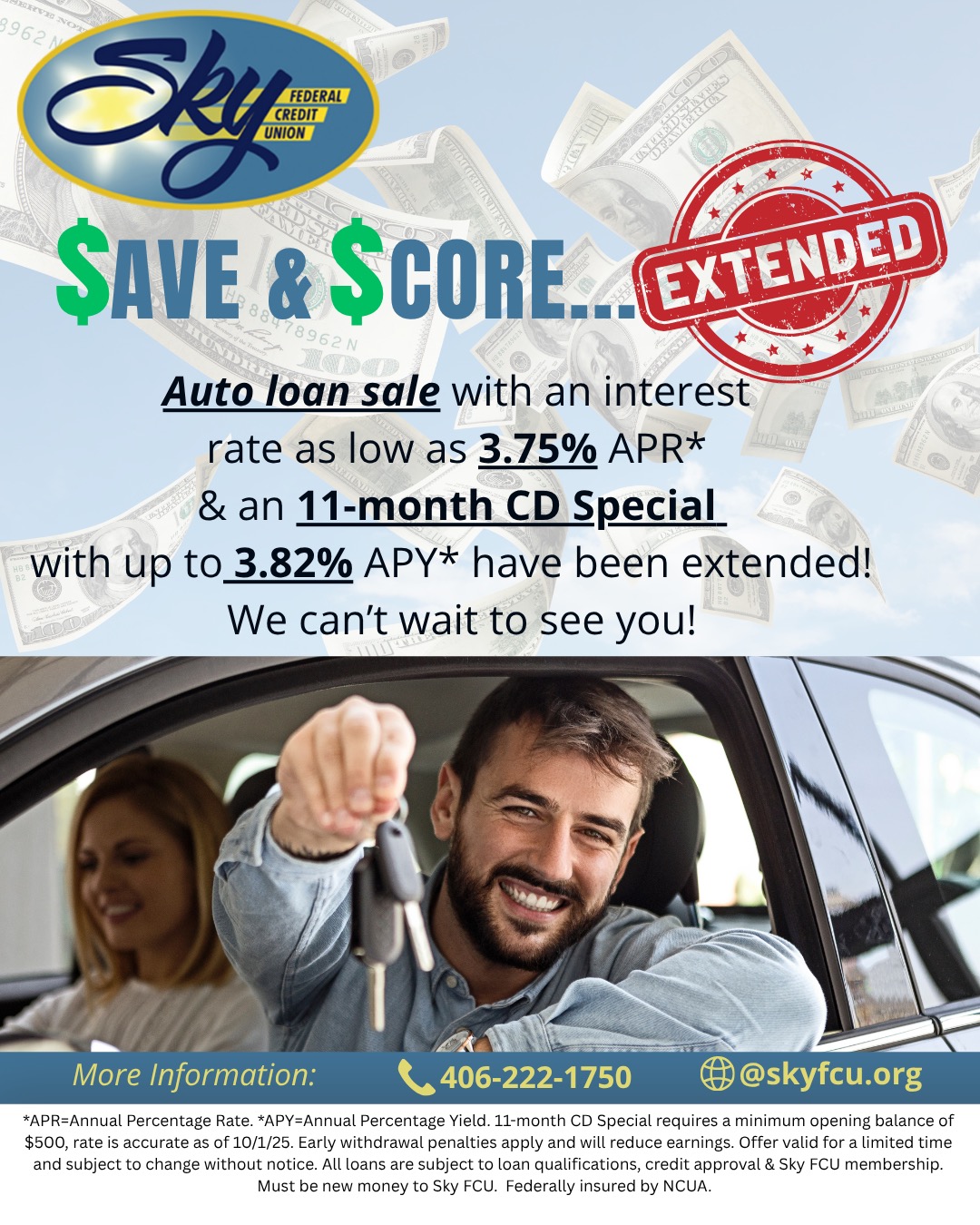 *APR=Annual Percentage Rate. *APY=Annual Percentage Yield. 11-month CD Special requires a minimum opening balance of $500, rate is accurate as of 10/1/25. Early withdrawal penalties apply and will reduce earnings. Offer valid for a limited time and subject to change without notice. All loans are subject to loan qualifications, credit approval & Sky FCU membership. Must be new money to Sky FCU.  Federally insured by NCUA.